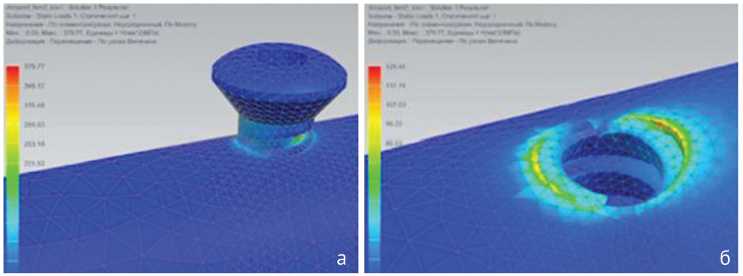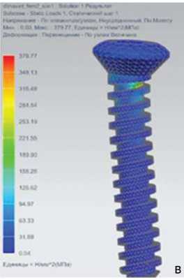 Анализ НДС модели пары винт – кость проводили для выявления механизмов возникновения нестабильности винта, приводящих к развитию осложнений остеосинтеза. Изучение полей напряжения при взаимодействии винта с костью при тангенциальной и осевой нагрузке показало, что наибольшая концентрация напряжений в винте возникала около его головки, к которой прикладывается срезывающая сила от пластины (рис. 6). В кости наибольшая концентрация напряжений возникала в районе максимальных напряжений в винте, а именно на входе винта в кость.
