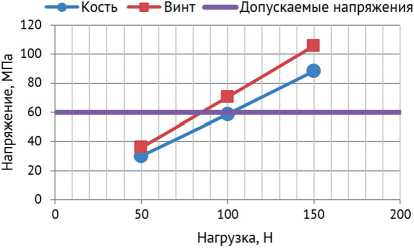 При осевой нагрузке наибольшую концентрацию напряжений в винте отмечали в области трех первых витков резьбы, а в кости — в области входа в нее винта. Максимальные напряжения в кости также линейно зависели от приложенной осевой нагрузки на винт при его закручивании. При нагрузке в 150 Н получено максимальное эквивалентное напряжение в кости 88,4МПа, что превышает допускаемые значения напряжения в кости, вследствие чего не исключается возможность разрушения и резорбции костной ткани в области контакта с элементами связи пластины с костью и нарушения стабильности остеосинтеза (рис. 7). Из графика также следует, что осевая нагрузка на винт, превышающая 100 Н, вызывает в кости максимальные нормальные напряжения, превышающие их допускаемые значения.