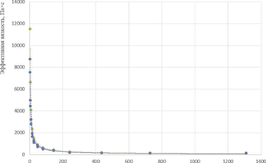 Эффективная вязкость — фундаментальная реологическая характеристика, определяющая технологические параметры дисперсных систем пищевого производства. Изучение динамики эффективной вязкости в зависимости от градиента скорости, дает возможность охарактеризовать деформацию молочного геля [21-23] и позволяет достоверно определить неньютоновское поведение системы.