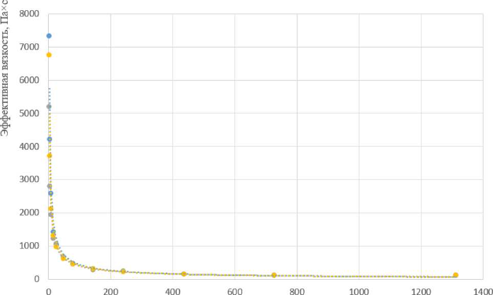 Таблица 3 – Зависимости эффективной вязкости (η, мПа·с) от скорости деформации (γ, с-1) для модельных образцов с применением стабилизаторов