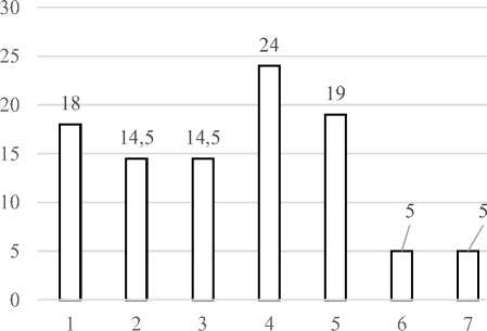 Рисунок 2. Интенсивность синерезиса ацидофилина, %: 1 – 15 мин, 2 – 30 мин, 3 – 1 ч, 4 – 2 ч, 5 – 3 ч, 6 – 4 ч, 7 – 5 ч Figure 2. Intensity of acidophilus syneresis, %: 1 – 15 min, 2 – 30 min, 3 – 1 hour, 4 – 2 hours, 5 – 3 hours, 6 – 4 hours, 7 – 5 hours