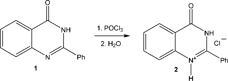В связи с этим структурные особенности 2-фенилхиназолин-4-она и его солевых производных заслуживают внимания синтетиков, изучающих пути создания новых гетероциклических соединений бензодиазинового ряда. В данной работе нами изучена структура гидрохлорида 2-фенилхиназолин-4( 3H )-она методом РСА, в т.ч. в сравнении с таковой для соответствующей нейтральной молекулы.