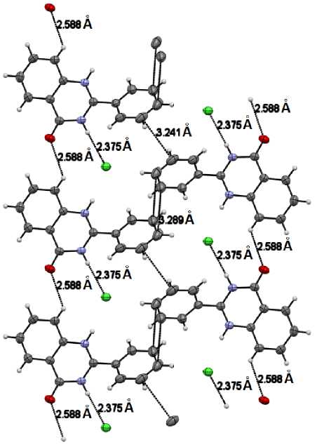 В рамках работы изучена структура гидрохлорида 2-фенилхиназолин-4(3Н)-она методом РСА, в т. ч. в сравнении с таковой для соответствующей нейтральной молекулы. При этом обнаружена более сложная упаковка молекул в кристалле в случае гидрохлорида. Результаты рентгеноструктурного анализа зарегистрированы в Кембриджской базе структурных данных под номером CCDC 2448813. Для описываемого гидрохлорида следует отметить межмолекулярные водородные связи, реализующиеся в псевдослое: C(8)-H…Cl(1), C(8)-H…O(1), N(1) H…Cl(1). Кроме того, между фенильными заместителями соседних молекул наблюдается π стэкинг. Слоистая структура стабилизируется за счет слабых нецентрированных взаимодействий электронно-дефицитного атома углерода хиназолинонового цикла, связанного с двумя электроноакцепторными атомами азота, и анионом хлора (C(2)…Cl– 3,40(9) Å). Подобные нековалентные взаимодействия между электронно-дефицитными ароматическими системами и анионами согласно имеющимся в литературе теоретическим и экспериментальным научным исследованиям энергетически выгодны и получают значительное признание ввиду того, что играют важную роль для многих ключевых химических и биологических процессов.