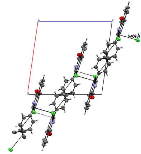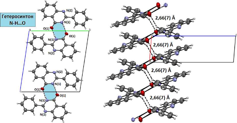 В свою очередь для кристалла нейтрального соединения 1 наблюдается более простая упаковка молекул, вызванная их ассоциацией в димеры посредством межмолекулярных водородных связей N(1)-H…O(1) (1,99(8) Å) в двухточечном гетеросинтоне (рис. 4). Каждая из молекул димера участвует в образовании слабых взаимодействий С(10) Ph -H…O(1) (2,66(7) Å), формируя стопки вдоль оси а (рис. 5).