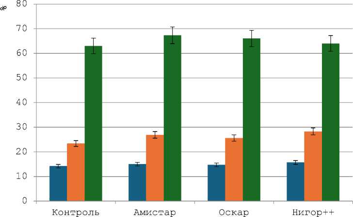 Прибавка урожая зерна ярового ячменя по отношению к контролю за годы исследований во всех вариантах составила 4,5% -10,3% [13]. Наиболее высокий результат увеличения протеина в зерне ярового ячменя получен в варианте при обработке Нигор++ (14,4%), крахмала в варианте при обработке Амистар Экстра (62,8%) (рис.2).
