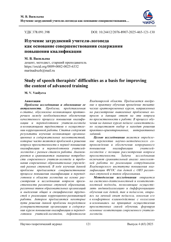 Проблема исследования и обоснование ее актуальности. Проблема, представленная в статье, обусловлена возникающим противоречием между необходимостью обеспечения качественного процесса повышения квалификации и переподготовки учителя-логопеда и возникающими трудностями в осуществлении коррекционной работы. Статья содержит результаты изучения возникающих организационных и содержательных несоответствий, которые часто являются проблемой в решении вопроса преемственности в период повышения квалификации и переподготовки учителейлогопедов с разным стажем работы. Анализируются и сравниваются знаниевые потребности современного учителя-логопеда и требования современных образовательных учреждений разных ступеней. В ходе изучения данной проблемы предлагается совершенствование процесса повышения квалификации и переподготовки в области логопедии на основе рассмотрения и исследования вопросов преемственности различных ступеней образования, различных типов образовательных организаций и выделения общих и специфических трудностей в реализации коррекционно-развивающей работы. Автором предлагаются некоторые пути решения данной проблемы посредством усовершенствования организации и содержания курсов повышения квалификации и переподготовки учителей-логопедов, дефектологов Владимирской области. Предлагается внедрение в практику обучения проведение тематических кратковременных курсов, направленных на рассмотрение выявленных проблемных вопросов и дающих ответ на эти вопросы по преемственности в работе. В процессе обучения на данных курсах педагог самостоятельно осуществляет выбор и находит решения практико-ориентированных, интерактивных заданий. Целью исследования является определение перспектив научно-методического сопровождения и обеспечения непрерывного повышения квалификации учителейлогопедов с позиции рассмотрения вопроса преемственности. Задачи исследования включают сравнительный анализ многолетней работы по реализации сотрудниками Владимирского института повышения квалификации ФГОС для детей с ОВЗ различных ступеней и типов образования. Методология исследования опирается на системно-деятельностный и компетентностный подходы, позволяющие осуществлять индивидуализацию и дифференциацию обучения как детей, так и педагогов, опираясь на личный опыт педагога, вовлекая его в комфортное взаимодействие с коллегами и основываясь на принципах осуществления преемственных связей обучения, формируя основные компетенции современного учителялогопеда. Результаты. Теоретическая значимость исследования состоит в том, что путем сравнительного анализа изучения вопроса преемственности в процессе переподготовки и повышения квалификации современного учителялогопеда определены теоретические и практико-ориентированные дефициты. Практическая значимость заключается в подготовке и создании дополнительных программ, позволяющих углублять и совершенствовать процесс переподготовки и повышения квалификации педагогов.