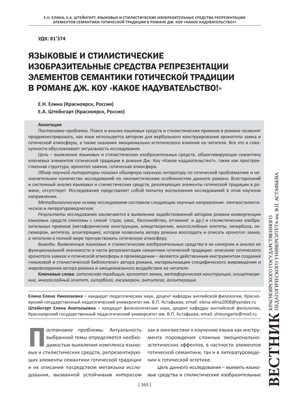 Постановка проблемы. Поиск и анализ языковых средств и стилистических приемов в романе позволят продемонстрировать, как язык используется автором для вербального конструирования хронотопа замка и готической атмосферы, а также оказания эмоционально-эстетического влияния на читателя. Все это в совокупности обусловливает актуальность исследования. Цель ‒ выявление языковых и стилистических изобразительных средств, объективирующих семантику ключевых элементов готической традиции в романе Дж. Коу «Какое надувательство!», таких как пространственная структура, хронотоп замков, готическая атмосфера. Обзор научной литературы показал обширную научную литературу по готической проблематике и незначительное количество исследований по лингвистическим особенностям данного романа. Всесторонний и системный анализ языковых и стилистических средств, реализующих элементы готической традиции в романе, отсутствует. Исследование представляет собой попытку восполнения исследований в этом научном направлении. Методологическую основу исследования составили следующие научные направления: лингвостилистическое и литературоведческое. Результаты исследования заключаются в выявлении задействованной автором романа конвергенции языковых средств (лексемы с семой ‘страх, ужас, беспокойство, отчаяние’ и др.) и стилистических изобразительных приемов (метафорические конструкции, олицетворения, многослойные эпитеты, гипербола, оксюморон, антитеза, аллитерация), которая позволила автору романа воссоздать и описать хронотоп замка, а читателю в полной мере прочувствовать готическую атмосферу. Выводы. Выявленные языковые и стилистические изобразительные средства в их синергии и анализ их функциональной значимости в части репрезентации семантики готической традиции: описание готического хронотопа замков и готической атмосферы в произведении – являются действенным инструментом создания «языковой и стилистической библиотеки» автора романа, материализации специфического мировидения и мировоззрения автора романа и эмоционального воздействия на читателя.