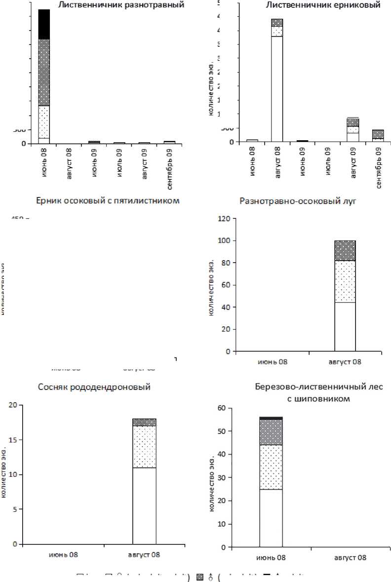 Половозрастная структура данного вида в районе исследования рассмотрена в 6 биотопах. Сезонную динамику рассматривали в основном в лиственничниках, поскольку в части биотопов вид встречается только в одном из сроков (рис. 1).