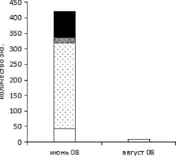 О периодах размножения X. obscura можно делать выводы, если в этих сроках в половозрастной структуре присутствуют репродуктивные самцы. На сводном графике по всем биотопам можно увидеть более наглядно изменение соотношений различных половозрастных групп в течение сезона (рис. 2). По нашим данным, пик размножения вида наблюдается в первой половине лета. На это указывает преобладание в июне в половозрастной структуре взрослых особей (94 %), большая часть которых (77 %) самцы, при этом 27 % из них репродуктивные. К концу лета в большом количестве появляются ювенильные особи. В августе 2008 г. популяции X. obscura в основном представлены ювенилами, в половозрастной структуре на них приходится 85 %. Самцы составляют в этот срок 42 %, при этом генеративных самцов не обнаружено. К концу сентября (2009 г.) доля ювенилов значительно снижается (14 %), при этом большая часть (75 %) взрослых особей — предгенера-тивные самцы. По-видимому, появившиеся в большом количестве в августе юве-нилы к октябрю завершают рост и уходят на зимовку в предгенеративном состоянии. Достигшие половозрелости к весне или началу следующего лета, особи приступают к размножению. Находка размножающихся самцов в августе 2009 г. в ерниковом лиственничнике позволяет предположить возможность растянутого репродуктивного периода, что требует дальнейших исследований.
