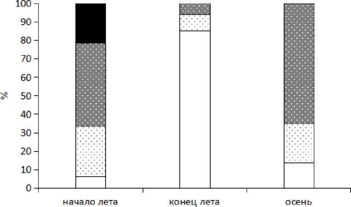 Рис. 2 . Половозрастная структура популяций X. obscura юга Витимского плоскогорья (сводная по всем биотопам) (начало лета объединяет данные всех биотопов по июню 2008 г., конец лета — по августу 2008 г., осень — по сентябрю 2009 г.)