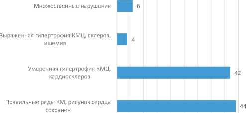 Результаты показывают, что при умеренной гипертрофии кардиомиоцитов, измененном рисунке сердца, признаках склероза, развивался преимущественно отек межмышечного пространства (рис. 7).