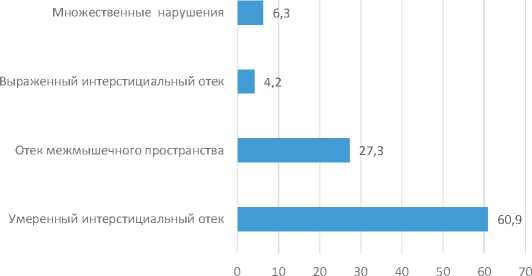 Как видим из представленных данных, чаще всего наблюдается умеренный интерстициальный отек (60,9 % случаев). В 27,3 % случаев наблюдается отек межмышечного пространства. Значительно реже отмечался выраженный интерстициальный отек и множественные нарушения в гистологической картине.