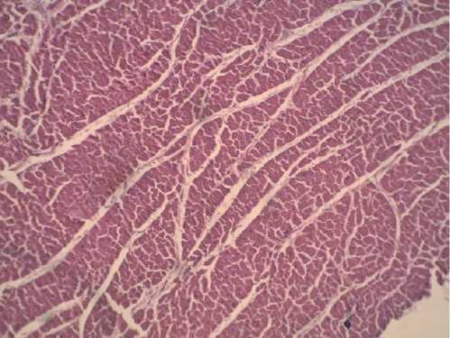 Пациент Д. поступил с некрозом поджелудочной железы, острым панкреатитом. Состояние осложнилось интоксикацией, что привело к летальному исходу. По результатам гистологии было установлено, что рисунок строения сердца сохранён, умеренно выраженный межмышечный отек; нерезкая, местами умеренная гипертрофия кардиомиоцитов; в отдельных полях зрения, полнокровие сосудов капиллярного типа, местами кардиомиоциты лишены ядер, фрагментированы, с исчезновением поперечной исчерченности мышечных волокон, периваскулярный фиброз.