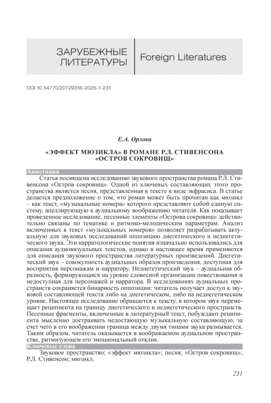 Статья посвящена исследованию звукового пространства романа Р.Л. Стивенсона «Остров сокровищ». Одной из ключевых составляющих этого пространства является песня, представленная в тексте в виде экфрасиса. В статье делается предположение о том, что роман может быть прочитан как мюзикл ‒ как текст, «музыкальные номера» которого представляют собой единую систему, апеллирующую к аудиальному воображению читателя. Как показывает проведенное исследование, песенные элементы «Острова сокровищ» действительно связаны по тематике и ритмико-мелодическим параметрам. Анализ включенных в текст «музыкальных номеров» позволяет разрабатывать актуальную для звуковых исследований оппозицию диегетического и недиегетического звука. Эти нарратологические понятия изначально использовались для описания аудиовизуальных текстов, однако в настоящее время применяются для описания звукового пространства литературных произведений. Диегетический звук ‒ совокупность аудиальных образов произведения, доступная для восприятия персонажам и нарратору. Недиегетический звук ‒ аудиальная образность, формирующаяся на уровне словесной организации повествования и недоступная для персонажей и нарратора. В исследованиях аудиальных пространств сохраняется бинарность оппозиции: читатель получает доступ к звуковой составляющей текста либо на диегетическом, либо на недиегетическом уровне. Настоящее исследование обращается к тексту, в котором звук перемещает реципиента на границу диегетического и недиегетического пространств. Песенные фрагменты, включенные в литературный текст, побуждают реципиента мысленно достраивать недостающую музыкальную составляющую, за счет чего в его воображении граница между двумя типами звука размывается. Таким образом, читатель оказывается в воображаемом аудиальном пространстве, ритмизующем его эмоциональный отклик.