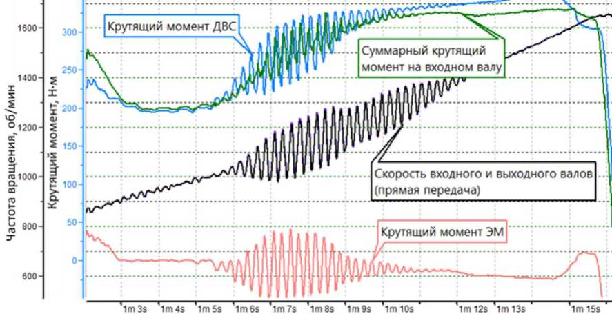 Рис. 1. Иллюстрация процесса возбуждения колебаний в трансмиссии гибридной установки крутящим моментом электромашины при замкнутой передаче