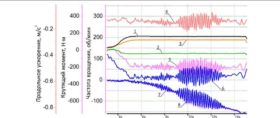 Fig. 3. Experimental reproduction of the phenomenon under consideration when launch in reverse gear: 1 – ICE torque; 2 – electric machine torque; 3 – total torque of the power unit; 4 – longitudinal acceleration of the body; 5 – front drive shaft speed; 6 – rear drive shaft speed; 7 – rear drive shaft torque; 8 – front drive shaft torque