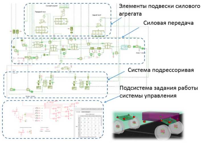 Для подтверждения предположения о взаимосвязи возникающих продольно-угловых колебаний корпуса автомобиля вследствие проявления колебательных процессов в элементах управления коробкой передач была разработана соответствующая имитационная модель транспортной машины, общий вид которой представлен на рис. 4. Разработанная модель позволяет анализировать: