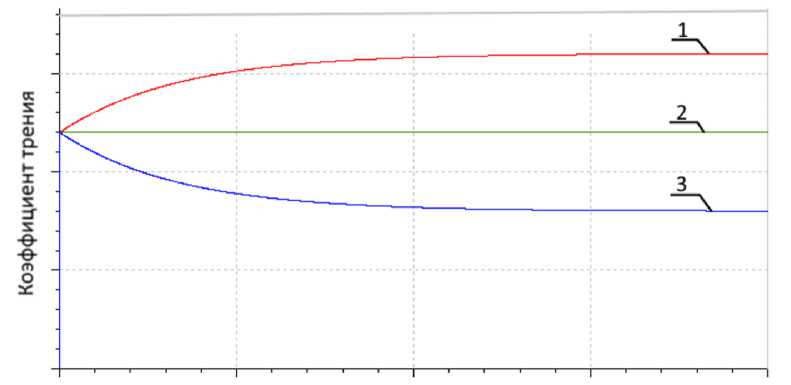 Рис. 5. Различная зависимость коэффициента трения от частоты скольжения: 1 – не склонная к возбуждению колебаний в системе; 2 – нейтральная; 3 – склонная к возбуждению колебаний в системе