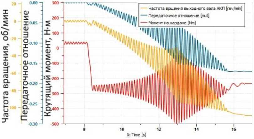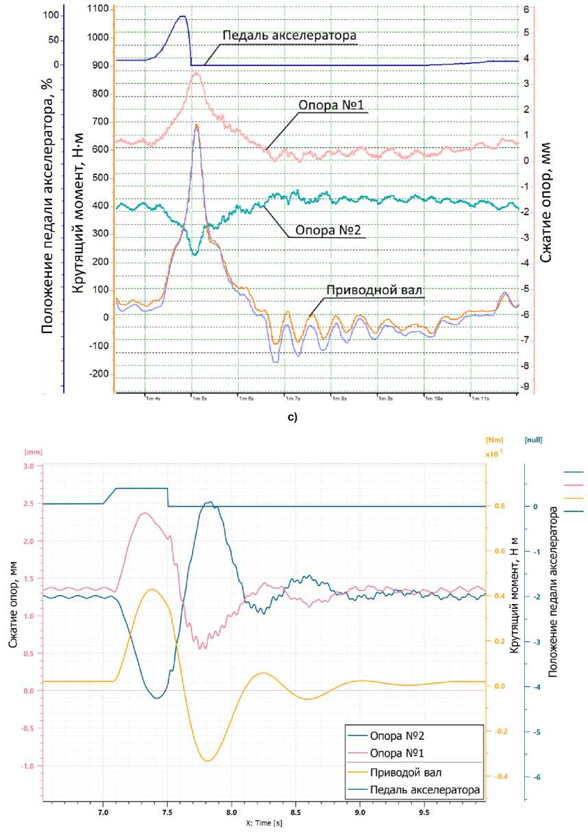 Пример сопоставления результатов моделирования с замерами, полученными при экспериментальном исследовании изучаемого явления, представлен на рис. 6. Можно увидеть, что с помощью разработанной модели удаётся воспроизвести возникновение колебательных процессов при трогании транспортного средства. Видно совпадение количественных показателей, характеризующих работу трансмиссии: крутящий момент, деформация в опорах, изменение частоты вращения валов. Кроме того, совпадают частоты возникших колебательных процессов при трогании, а также при выполнении типового манёвра при резком нажатии и отпускании педали акселератора на замкнутой передаче.