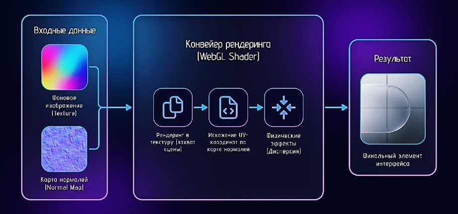 Алгоритм рендеринга прозрачного материала, имитирующего рефракцию, как правило, включает многопроходную обработку: предварительный рендеринг сцены в текстуру (render target), последующее искажение UV-координат на основе карты нормалей объекта (transmission pass) и применение дополнительных оптических эффектов, таких как эффект Френеля или цветовая дисперсия. Подобная архитектура требует явного управления буферами и порядком проходов, что усложняет пайплайн по сравнению с декларативными CSS-решениями. В этой связи целесообразно использовать схему конвейера рендеринга (Рисунок), иллюстрирующую последовательность этапов обработки — от исходной текстуры фона и карты нормалей до формирования финального пикселя через шейдер рефракции.