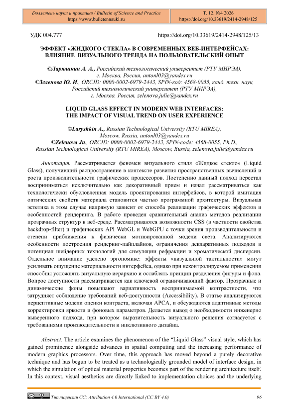 Рассматривается феномен визуального стиля «Жидкое стекло» (Liquid Glass), получивший распространение в контексте развития пространственных вычислений и роста производительности графических процессоров. Постепенно данный подход перестал восприниматься исключительно как декоративный прием и начал рассматриваться как технологически обусловленная модель проектирования интерфейсов, в которой имитация оптических свойств материала становится частью программной архитектуры. Визуальная эстетика в этом случае напрямую зависит от способа реализации графических эффектов и особенностей рендеринга. В работе проведен сравнительный анализ методов реализации прозрачных структур в веб-среде. Рассматриваются возможности CSS (в частности свойства backdrop-filter) и графических API WebGL и WebGPU с точки зрения производительности и степени приближения к физически мотивированной модели света. Анализируются особенности построения рендеринг-пайплайнов, ограничения декларативных подходов и потенциал шейдерных технологий для симуляции рефракции и хроматической дисперсии. Отдельное внимание уделено эргономике: эффекты «визуальной тактильности» могут усиливать ощущение материальности интерфейса, однако при неконтролируемом применении способны усложнять визуальную иерархию и ослаблять принцип разделения фигуры и фона. Вопрос доступности рассматривается как ключевой ограничивающий фактор. Прозрачные и динамические фоны повышают вариативность воспринимаемой контрастности, что затрудняет соблюдение требований веб-доступности (Accessibility). В статье анализируются перцептивные модели оценки контраста, включая APCA, и обсуждаются адаптивные методы корректировки яркости и фоновых параметров. Делается вывод о необходимости инженерно выверенного подхода, при котором выразительность визуального решения согласуется с требованиями производительности и инклюзивного дизайна.