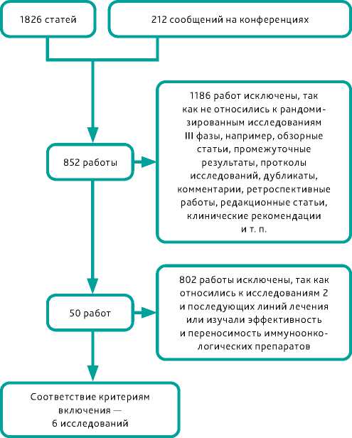 После скрининга названий статей и тезисов был проведен отбор литературных источников двумя независимыми экспертами. Затем был создан перечень литературных источников для оценки соответствия критериям включения в анализ. Оба эксперта должны были согласиться с включением исследования в мета-анализ; в случае несогласия третий эксперт должен был оценить возможность включения исследования в работу. После отбора исследований была сформирована таблица с результатами исследований с указанием основного критерия эффективности — ОВ — и данных по относительному риску смерти (ОР) с 95% доверительным интервалом (95% ДИ) для ITT популяций и для подгрупп в зависимости от степени экспрессии PD-L1 в опухоли по градации CPS. Дополнительно указывался первый автор работы, страна или страны, в которых проводилось исследование, оценка качества жизни, доля пациентов с экспрессией PD-L1 СPS ≥1, ≥5 и ≥10. Диаграмма отбора исследований для анализа представлена на рис. 1.