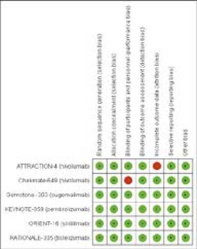 Все включенные исследования были рандомизированными; все, за исключением исследования ATTRACTION-4, представили полные данные; все, за исключением исследования CHECKMATE-649, применяли двойной слепой метод; по другим критериям риска систематических ошибок отклонений не отмечено (рис. 4, 5).