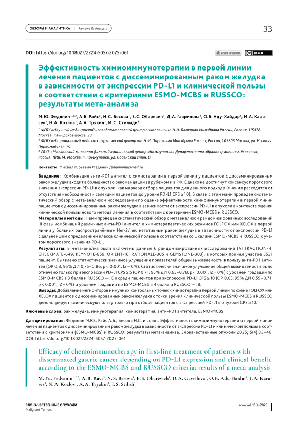 Эффективность химиоиммунотерапии в первой линии лечения пациентов с диссеминированным раком желудка в зависимости от экспрессии PD‑L1 и клинической пользы в соответствии с критериями (ESMO‑MCBS) и RUSSCO: результаты мета‑анализа
