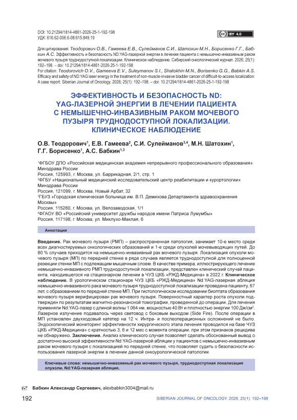 Эффективность и безопасность ND:YAG-лазерной энергии в лечении пациента с немышечно-инвазивным раком мочевого пузыря труднодоступной локализации