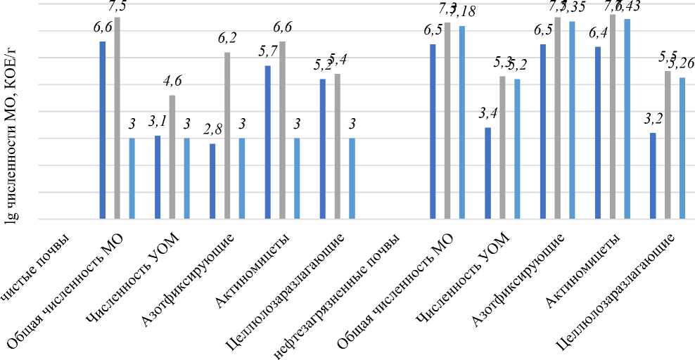 Рисунок. Влияние загрязнения почвы нефтью на изменение общей численности гетеротрофных почвенных микроорганизмов