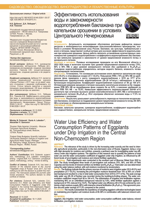 Актуальность. Актуальность исследования обусловлена растущим дефицитом водных ресурсов и необходимостью интенсификации сельскохозяйственного производства, особенно в условиях Нечерноземной зоны России. Баклажан, как культура, требовательная к влаге и питанию, представляет особый интерес для изучения эффективности водопользования при капельном орошении. Целью работы являлось установление количественных закономерностей суммарного водопотребления и коэффициента водопотребления (Кв) баклажана при капельном орошении в зависимости от уровня предполивной влажности почвы и минерального питания. Материал и методика. Полевые исследования проводили на юге Московской области в 2022–2024 годах и включали изучение трех уровней предполивной влажности почвы (70%, 80% и 90% НВ) и двух уровней минерального питания (без удобрений и N150P90K140). Суммарное водопотребление определялось методом водного баланса, влажность почвы контролировали тензиометрами. Результаты. Установлено, что основными источниками влаги являются оросительная вода (35,5–65,2%) и атмосферные осадки (27,7–53,2%). Повышение ППВ с 70% до 90% НВ на удобренном фоне приводило к росту суммарного водопотребления с 3219 до 3777 м³/га. Максимальное среднесуточное водопотребление (29–39 м³/га/сут.) наблюдалось в фазы бутонизации–плодоношения. Коэффициент водопотребления изменялся от 80 до 104 м³/т. Оптимизация режимов орошения и питания оказывала значительное влияние на Кв: поддержание ППВ 90% НВ на неудобренном фоне снижало Кв на 9,8%, а внесение удобрений на фоне ППВ 70% НВ – на 10,8%. Наивысшая эффективность водопользования (Кв=84 м³/т) достигнута при сочетании высокого уровня влагообеспеченности (90% НВ) и интенсивного минерального питания (N150P90K140). Этот агроприем обеспечил экономию воды в 17,5% по сравнению с контролем. Заключение. Результаты доказывают целесообразность перехода на технологии возделывания баклажана, основанные на поддержании уровня предполивной влажности почвы 80–90% НВ в сочетании со сбалансированным минеральным питанием.