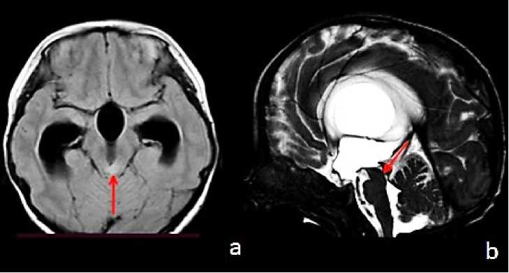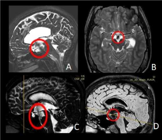 Для верификации уровня окклюзии ликворных путей выполнялось МРТ головного мозга с использованием фазово-контрастных последовательностей CSF_QF и прицельных тонкосрезовых сагиттальных сканов CSF DRIVE. На МР-изображениях определялся уровень блока ликворных путей, преимущественно на уровне Сильвиева водопровода (Рисунок 1).