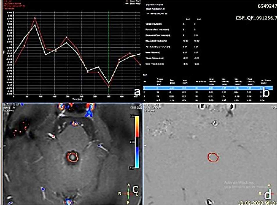 Рисунок 2. Оценка ликвородинамики по данным фазово-контрастной МРТ (CSF_PCA): A — кривая ликворотока с отсутствием нисходящего потока; B — скоростные характеристики ликвора; C, D — проекция Сильвиева водопровода для оценки пассажа ликвора