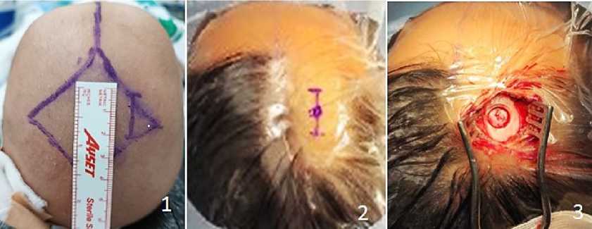 В зависимости от возраста пациента и состояния большого родничка применялись два варианта хирургического доступа: трансродничковый доступ — у 18 пациентов (69,2%) при открытом большом родничке; доступ через трефинационное отверстие в точке Кохера — у 8 пациентов (30,8%) при закрытом большом родничке.