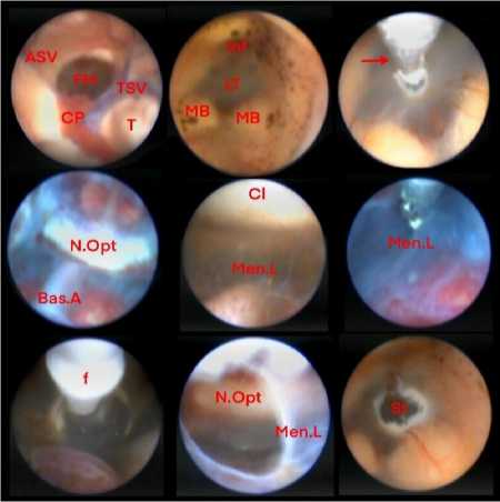 Рисунок 4. Эндоскопические этапы выполнения вентрикулоцистерностомии дна III желудочка и основные анатомические ориентиры. Эндоскопическая визуализация структур бокового и III желудочков и базальных цистерн: FM — отверстие Монро (foramen Monro); MB — сосцевидные тела (mammillary bodies); TSV — таламо-стриарная вена (thalamostriate vein); ASV — передняя септальная вена (anterior septal vein); CP — сосудистое сплетение (choroid plexus); T — таламус (thalamus); Bas.A — базилярная артерия (basilar artery); N.Opt — перекрёст зрительных нервов (optic chiasm, атипичное расположение); Mem.L — мембрана Лилийеквиста (membrane of Liliequist); Cl — скат (clivus); f — баллонный катетер Фогарти; st — сформированная стома дна III желудочка. Красной стрелкой обозначены вентрикулостомические щипцы.