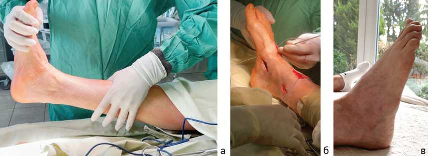Рис. 1. Фото стопы пациента с синдромом «висящей стопы»: а — исходный вид; б — интраоперационное изображение; в — отдаленный период через 8 мес.