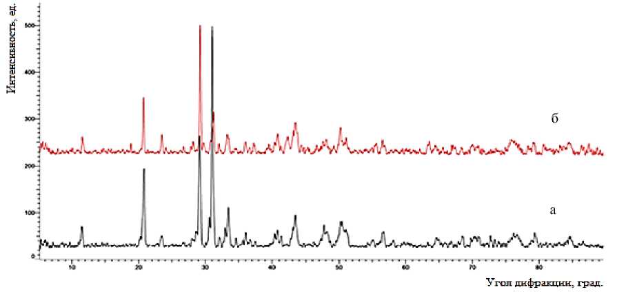 Рисунок 1 – Рентгенограммы гипсового камня: а – контрольный состав, без добавки; б – с добавкой CaCl 2 , 0,2 % от массы гипса