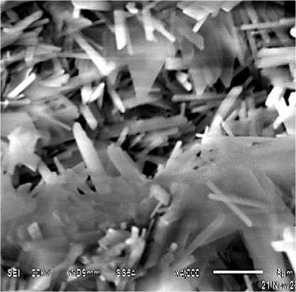 Для подтверждения физико-механических испытаний и РФА проводился микроструктурный анализ (рис. 2). На электронно-микроскопических снимках гипсового камня исходного состава видны удлиненные пластинчатые кристаллы двугидрата сульфата кальция (рис. 2 а). При введении ультрадисперсной добавки в виде коллоидного раствора образуется плотная микроструктура, включающая кристаллы пластинчатой и волокнистой морфологии, а также гидратные новообразования с плотной кристаллической упаковкой (рис. 2 б).