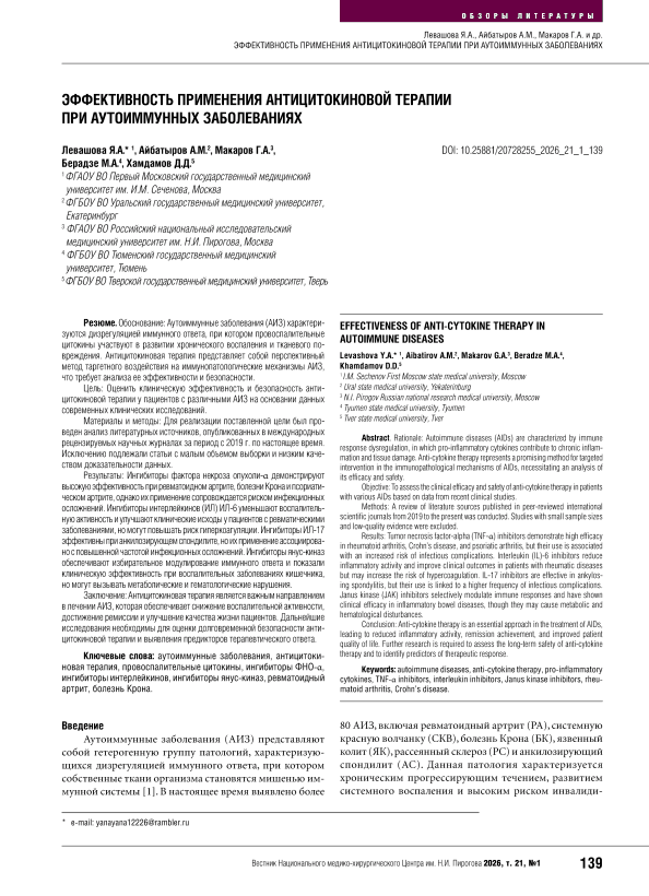 Обоснование. Аутоиммунные заболевания (АИЗ) характеризуются дизрегуляцией иммунного ответа, при котором провоспалительные цитокины участвуют в развитии хронического воспаления и тканевого повреждения. Антицитокиновая терапия представляет собой перспективный метод таргетного воздействия на иммунопатологические механизмы АИЗ, что требует анализа ее эффективности и безопасности. Цель. Оценить клиническую эффективность и безопасность антицитокиновой терапии у пациентов с различными АИЗ на основании данных современных клинических исследований. Материалы и методы. Для реализации поставленной цели был проведен анализ литературных источников, опубликованных в международных рецензируемых научных журналах за период с 2019 г. по настоящее время. Исключению подлежали статьи с малым объемом выборки и низким качеством доказательности данных. Результаты. Ингибиторы фактора некроза опухоли-α демонстрируют высокую эффективность при ревматоидном артрите, болезни Крона и псориатическом артрите, однако их применение сопровождается риском инфекционных осложнений. Ингибиторы интерлейкинов (ИЛ) ИЛ-6 уменьшают воспалительную активность и улучшают клинические исходы у пациентов с ревматическими заболеваниями, но могут повышать риск гиперкоагуляции. Ингибиторы ИЛ-17 эффективны при анкилозирующем спондилите, но их применение ассоциировано с повышенной частотой инфекционных осложнений. Ингибиторы янус-киназ обеспечивают избирательное модулирование иммунного ответа и показали клиническую эффективность при воспалительных заболеваниях кишечника, но могут вызывать метаболические и гематологические нарушения. Заключение. Антицитокиновая терапия является важным направлением в лечении АИЗ, которая обеспечивает снижение воспалительной активности, достижение ремиссии и улучшение качества жизни пациентов. Дальнейшие исследования необходимы для оценки долговременной безопасности антицитокиновой терапии и выявления предикторов терапевтического ответа.