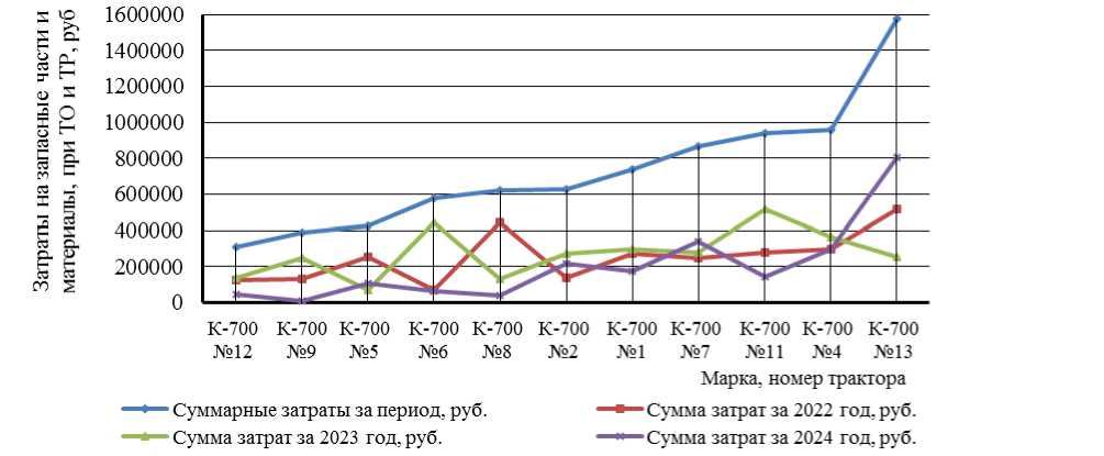 Рисунок 1 – Анализ затрат за 2022, 2023, 2024 годы на ТО и ТР по тракторам марки К-700