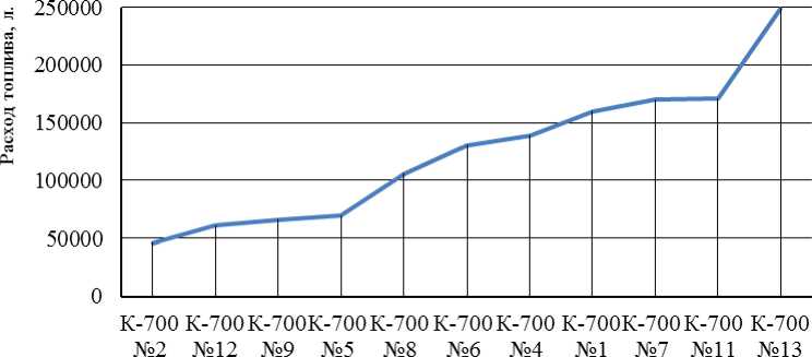 Анализ рисунка 2 показывает, что наиболее интенсивно за данный период использовался трактор К-701 № 13, что совпадает с максимумом затрат на данный трактор, но данная закономерность не поддерживается другими машинами, например трактор К-701 № 2, имеет минимальную наработку за анализируемый период, но при этом среднее значение расходов на ТО и ТР. Трактор К-700 № 11, второй по количеству израсходованного топлива за два года, так же имеет среднее значение затрат на ТО и ремонт, немного превышающее затраты на трактор К-701 № 2. Таким образом, рост затрат на поддержание парка тракторов марки К-701 в работоспособном состоянии можно связать с увеличением простоев данных тракторов, из-за ресурсных и внезапных отказов. При этом одной из причин увеличения затрат можно назвать недостаток диагностической информации о состоянии узлов и агрегатов, что позволило бы предупредить внезапные отказы. То есть на предприятиях агропромышленного комплекса, состоящего на данный момент из машин разных по технической оснащенности бортовыми средствами диагностирования, больший процент которых не имеет их в своей конструкции, актуальной задачей является внедрение системы диагностирования, основанной на получение систематической и достоверной информации.