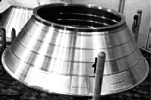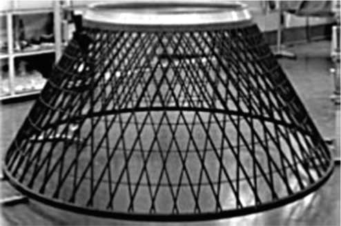 Экспериментальная отработка СК началась в 1970-х гг. В сетчатых конструкциях наиболее полно проявляются достоинства современных композитов и преимущества специфических для композитов технологических процессов. Наиболее крупногабаритными конструкциями (диаметром более 4 м) являются серийно производящиеся в Центральном научно-исследовательском институте специального машиностроения (ЦНИИСМ) отсеки отечественной ракеты-носителя «Протон-М» [25, 27, 28]. Первым (в 2004 г.) был заменён адаптер (элемент соединения РН и КА). При диаметре нижнего основания 2 500 мм, диаметре верхнего основания 1 300 мм и высоте 900 мм, масса композитного адаптера была на 60% меньше заменяемого алюминиевого, а стоимость меньше на 30% (рис. 9). В дальнейшем на СК были заменены верхний и нижний переходные отсеки второй ступени. Диаметр 4 100 мм, длина — ~3 000 мм; уменьшение массы верхнего отсека на 20%, нижнего переходного отсека — на 38%. Данные мероприятия позволили получить выигрыш в весе ~500 кг [28]. В период до 2009 г. было осуществлено 18 успешных запусков РН «Протон-М» с композитным адаптером.