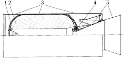 Рис. 4. Конструкционная схема современного крупногабаритного твёрдотопливного ракетного двигателя [9]: 1 — воспламенители; 2 — прочноскреплённый заряд смесевого твёрдого топлива; 3 — корпус типа «кокон» с удлинёнными узлами стыка; 4 — эластичный опорный шарнир; 5 — поворотное управляемое сопло с переменной геометрией
