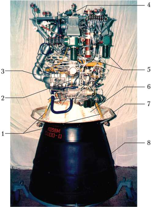 Рис. 5. Блок тяги маршевого двигателя 11Д58М [12]: 1 — дренажи; 2 — турбонасосный агрегат; 3 — газовод от турбины к камере сгорания; 4 — силовая рама; 5 — рулевые машинки; 6 — камера; 7 — экран; 8 — насадок радиационного охлаждения