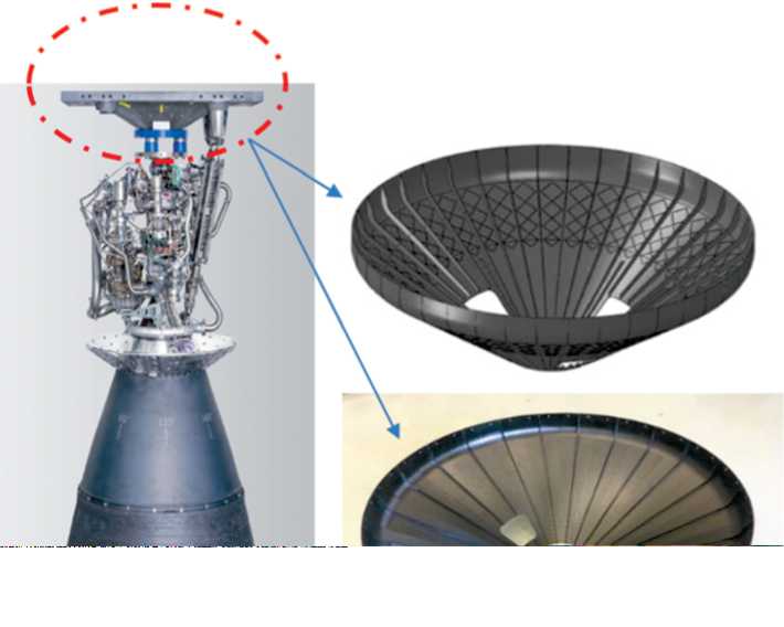 Композиционные материалы широко применяются в современных опорносиловых и несущих конструкциях авиационной и ракетно-космической техники с целью снижения массы изделий. Известны примеры использования конструкций из КМ в качестве переходных отсеков РН, центральных силовых элементов КА [18, 19]. В ракетных ДУ вполне возможно использование силовых рам из КМ. На рис. 7 показана рама для однокамерного кислородноводородного ЖРД Vinci . Детали рамы изготовлены по ткановыкладочной технологии. Двигатель оснащён углерод-керамическим (углерод-кремниевым)