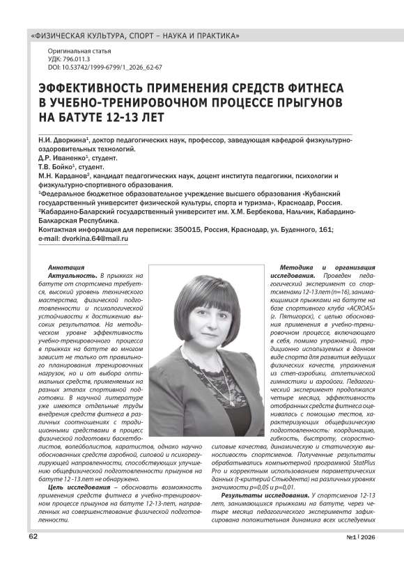 ЭФФЕКТИВНОСТЬ ПРИМЕНЕНИЯ СРЕДСТВ ФИТНЕСА В УЧЕБНО-ТРЕНИРОВОЧНОМ ПРОЦЕССЕ ПРЫГУНОВ НА БАТУТЕ 12-13 ЛЕТ
