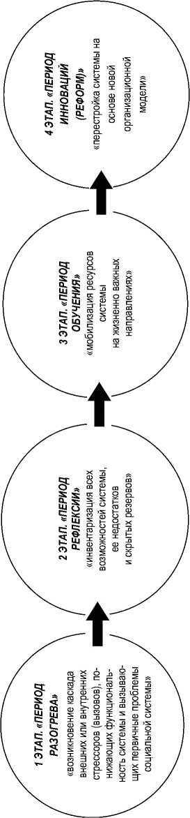 Отметим также, что в первой четверти XXI века в динамике последовательно сменяющих друг друга этапов эволюции («период разогрева», «период рефлексии», «период обучения» и «период инноваций»; вкладка 1), Российская Федерация, на наш взгляд, находится между первым и вторым этапом (между «периодом разогрева» и «периодом рефлексии»), поскольку «каскад внутренних и внешних вызовов» имеет место, но еще не преодолен; «инвентаризация всех возможностей системы, ее недостатков и скрытых резервов» проводится, но пока рано говорить о том, что все ресурсы системы «мобилизованы».