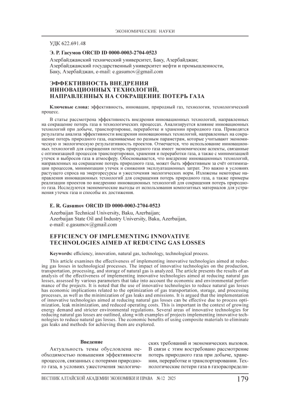 В статье рассмотрена эффективность внедрения инновационных технологий, направленных на сокращение потерь газа в технологических процессах. Анализируется влияние инновационных технологий при добыче, транспортировке, переработке и хранении природного газа. Приводятся результаты анализа эффективности внедрения инновационных технологий, направленных на сокращение потерь природного газа, оцениваемые по разным параметрам, которые учитывают экономическую и экологическую результативность проектов. Отмечается, что использование инновационных технологий для сокращения потерь природного газа имеет экономические аспекты, связанные с оптимизацией процессов транспортировки, хранения и переработки газа, а также с минимизацией утечек и выбросов газа в атмосферу. Обосновывается, что внедрение инновационных технологий, направленных на сокращение потерь природного газа, может быть эффективным за счёт оптимизации процессов, минимизации утечек и снижения эксплуатационных затрат. Это важно в условиях растущего спроса на энергоресурсы и ужесточения экологических норм. Изложены некоторые направления инновационных технологий для сокращения потерь природного газа, а также примеры реализации проектов по внедрению инновационных технологий для сокращения потерь природного газа. Исследуются экономические выгоды от использования композитных материалов для устранения утечек газа и способы их достижения.