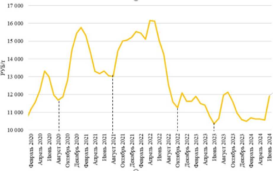 По данным исследований [6], цены на пшеницу в России в период с начала 2020 года до середины 2022 года характеризовались общей тенденцией к росту, с пиком в мае 2022 года, под влиянием мировых цен. Во второй половине 2022 года произошел резкий спад, обусловленный снижением мировых цен и рекордным урожаем в России. В 2023-2024 годах цены стабилизировались на низком уровне, что связано с высоким урожаем 2023 года и продолжающимся снижением мировых цен из-за избыточного предложения на мировом рынке.