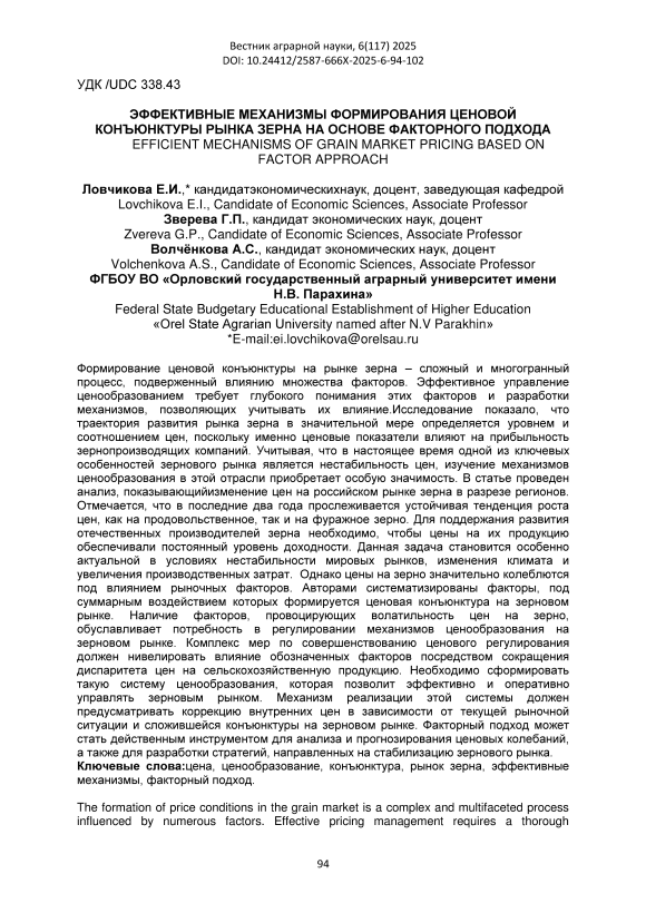 Формирование ценовой конъюнктуры на рынке зерна – сложный и многогранный процесс, подверженный влиянию множества факторов. Эффективное управление ценообразованием требует глубокого понимания этих факторов и разработки механизмов, позволяющих учитывать их влияние.Исследование показало, что траектория развития рынка зерна в значительной мере определяется уровнем и соотношением цен, поскольку именно ценовые показатели влияют на прибыльность зернопроизводящих компаний. Учитывая, что в настоящее время одной из ключевых особенностей зернового рынка является нестабильность цен, изучение механизмов ценообразования в этой отрасли приобретает особую значимость. В статье проведен анализ, показывающийизменение цен на российском рынке зерна в разрезе регионов. Отмечается, что в последние два года прослеживается устойчивая тенденция роста цен, как на продовольственное, так и на фуражное зерно. Для поддержания развития отечественных производителей зерна необходимо, чтобы цены на их продукцию обеспечивали постоянный уровень доходности. Данная задача становится особенно актуальной в условиях нестабильности мировых рынков, изменения климата и увеличения производственных затрат. Однако цены на зерно значительно колеблются под влиянием рыночных факторов. Авторами систематизированы факторы, под суммарным воздействием которых формируется ценовая конъюнктура на зерновом рынке. Наличие факторов, провоцирующих волатильность цен на зерно, обуславливает потребность в регулировании механизмов ценообразования на зерновом рынке. Комплекс мер по совершенствованию ценового регулирования должен нивелировать влияние обозначенных факторов посредством сокращения диспаритета цен на сельскохозяйственную продукцию. Необходимо сформировать такую систему ценообразования, которая позволит эффективно и оперативно управлять зерновым рынком. Механизм реализации этой системы должен предусматривать коррекцию внутренних цен в зависимости от текущей рыночной ситуации и сложившейся конъюнктуры на зерновом рынке. Факторный подход может стать действенным инструментом для анализа и прогнозирования ценовых колебаний, а также для разработки стратегий, направленных на стабилизацию зернового рынка.